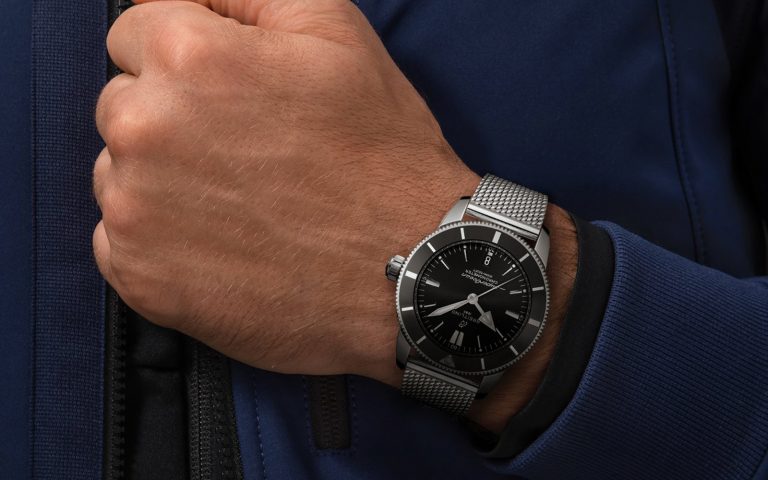 True to the essence of the 1957 legend, this model with 44 mm-diameter dial in black or blue is equipped with a sturdy steel mesh bracelet.