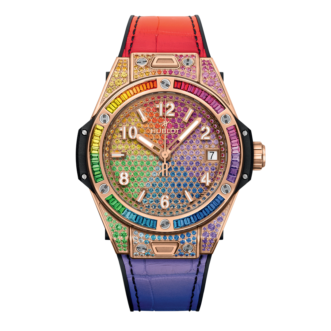 Step into a world of vibrant elegance with the Hublot Big Bang Unico King Gold Rainbow 39mm. Crafted with precision and flair, this timepiece features a captivating polished King Gold case that glimmers with a spectrum of colors. Adorned with an array of dazzling gemstones, including rubies, sapphires, and tsavorites, the bezel adds a touch of glamour to every moment. With its 39mm size, this watch offers a perfect balance of style and sophistication, making it the ultimate statement piece for those who appreciate luxury with a twist.