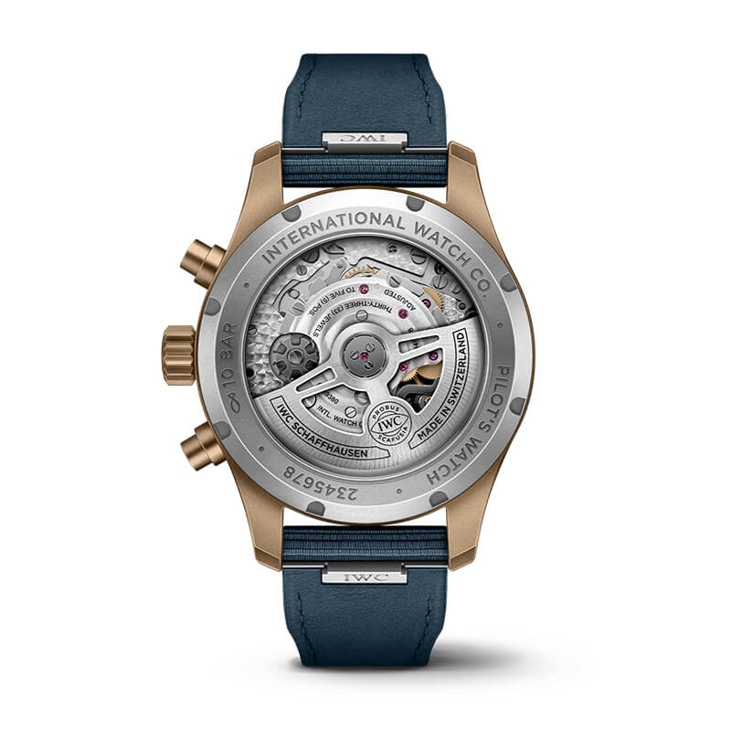 The Pilot’s Watch Chronograph 41 features a case, crown and pushers made of bronze, a unique material that develops a patina over time.
