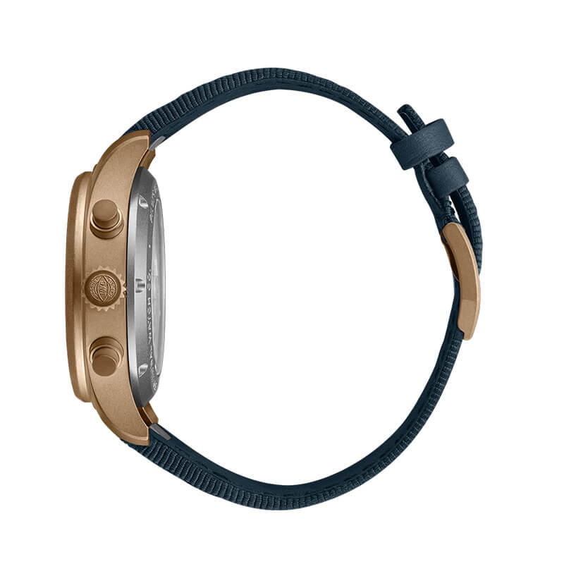 The chronograph is powered by the IWC-manufactured 69385 calibre. The movement enables stop time measurements of up to 12 hours and is engineered with a focus on robustness, reliability, and precision. The chronograph function is controlled by a column wheel. A bi-directional pawl winding system builds up a power reserve of up to 46 hours in the mainspring. Fitted on a blue textile strap, the chronograph also features IWC’s EasX-CHANGE®. It enables the wearer to change the strap at the touch of a button and without any additional tools.